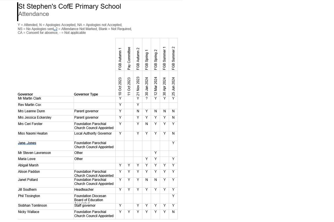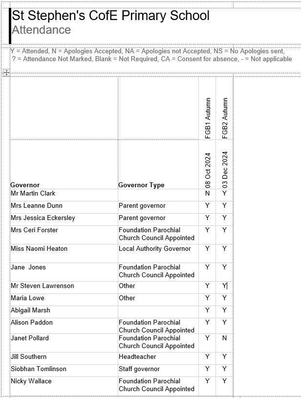 Meetings of the Full Governing Body are held once a term throughout the school year. Topics covered in meetings may include: planning the school's long term vision through the School Development Plan, the school budget, target setting and monitoring.